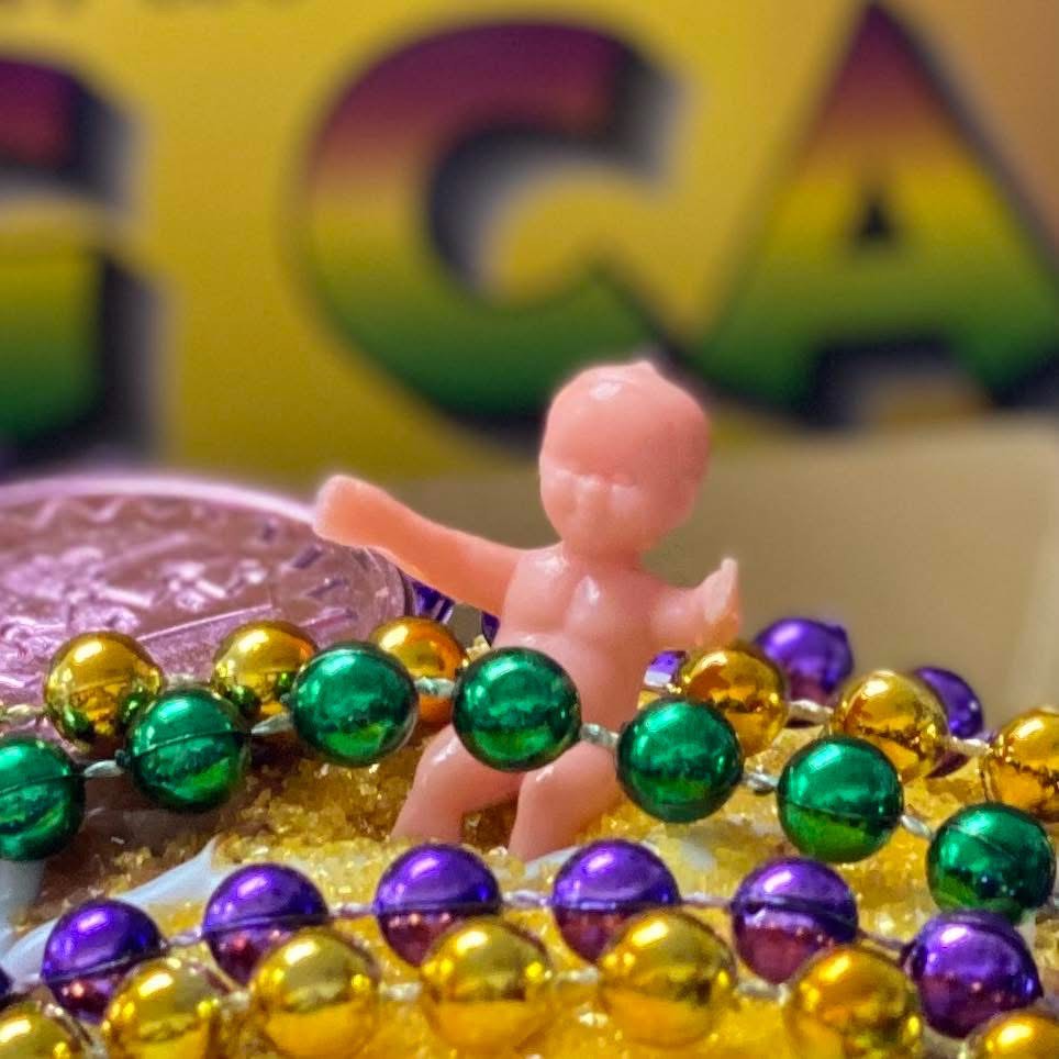 Shop allWhat's Included: Freshly baked King Cake (wrapped for freshness), Icing packet, Colored sugars (purple, green, and gold), Plastic baby, Printed instruction sheet with illustration